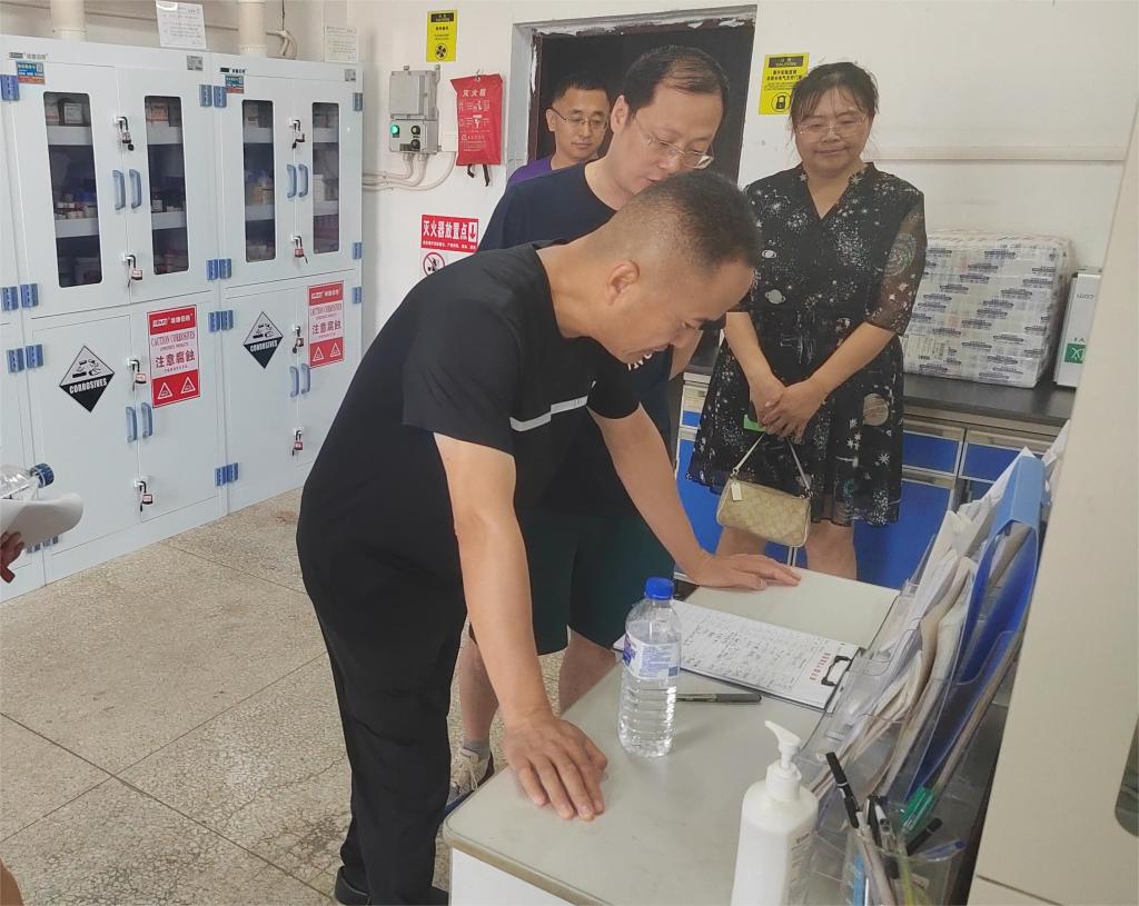 检查组深入化学学院、生命科学学院、物理学院、中心实验室、地理科学学院等单位实验室,重点对学生实验安全、消防安全、危险化学品安全等情况进行了实地查看,并与有关单位负责人及师生交流了解暑期实验室管理、使用情况,对存在的实验室安全隐患要求有效落实整改。整体来看,各单位高度重视暑期实验室安全管理,通过领导干部轮流值班、专人值班巡检等制度,多措并举保障实验室安全。