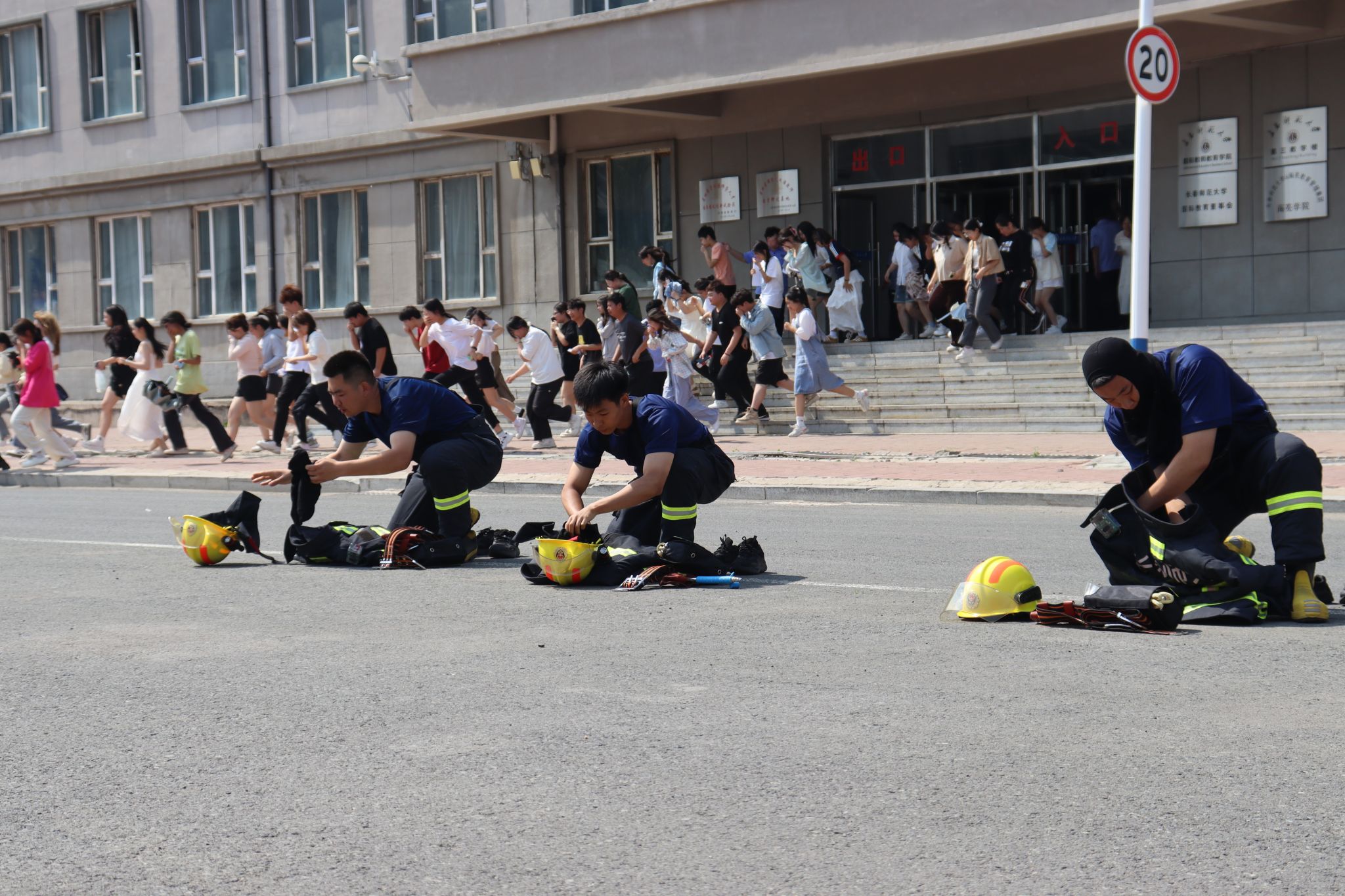 随着长春市二道区消防救援大队大队长、本次消防演练总指挥代宝喜宣布消防演练开始,本次消防演练在第三教学楼正式拉开帷幕。演练中,我校小型消防救援站全体队员在接警后,第一时间到达模拟火场附近进行疏散、灭火和救援工作。紧接着,东荣大路消防救援站、四通路消防救援站4辆消防车及消防救援人员到现场进行支援。消防救援人员利用云梯救援车、金属拉梯解救楼内被困师生,8分钟所有楼内师生解救到安全区域,消防演练圆满结束。