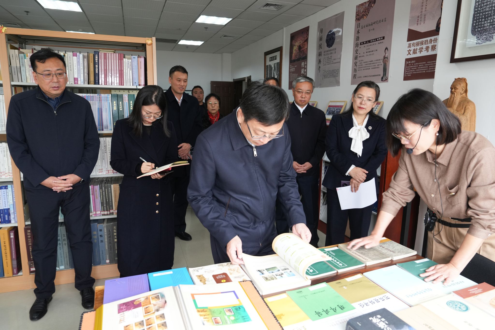 在教学综合楼,曹路宝首先听取了学校整体情况的汇报。在高句丽渤海文献中心,曹路宝详细询问史料来源和学校现阶段的研究情况,对学校高度重视中国史学科建设和高句丽渤海研究等工作给予充分肯定。针对吴大澂研究,曹路宝指出,要深入做好吴大澂奋斗历程、杰出贡献和历史功绩的研究工作,讲好吴大澂勘界守土、为寸土尽寸心的英雄壮举。在日本民间所藏侵华资料馆,曹路宝认真查阅了学校多年来收集的日本侵华相关史料,希望学校能够与南京大屠杀纪念馆加强沟通合作,进一步做好日本侵华史料的收集和研究工作。